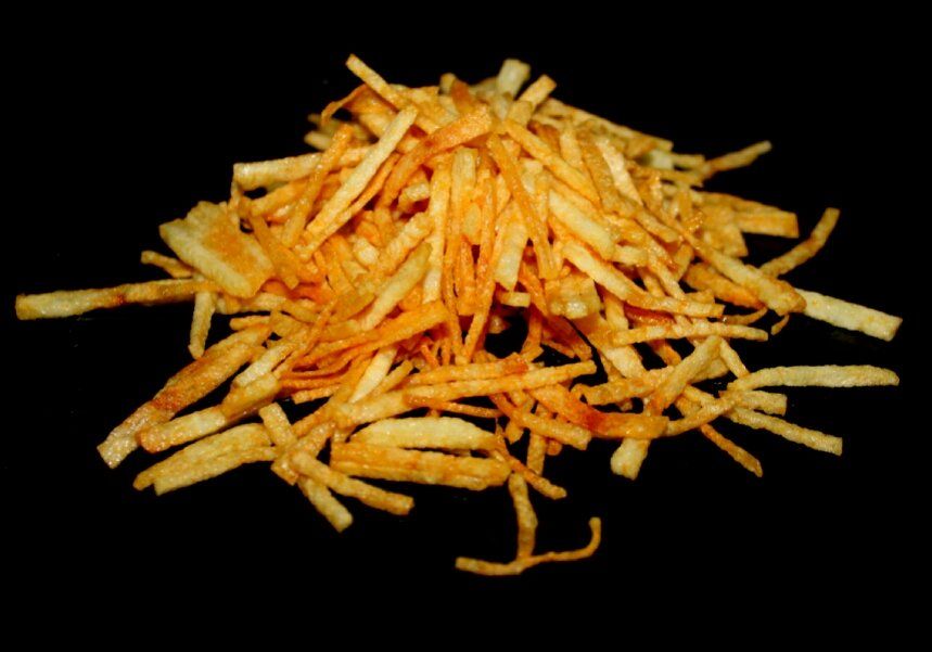 La patata... ayyy la patata... lo de siempre, la que conozcas que quede bien frita. Para esta receta necesitamos patatas paja, bastones finitos y tostados. Una opción muy buena es comprar las patatas paja en bolsa... pero bueno... igual que la tortilla patata, en vez de pelar, cortar y freir puedes usar patatas de bolsa, queda bien!, pero eso para una emergencia.