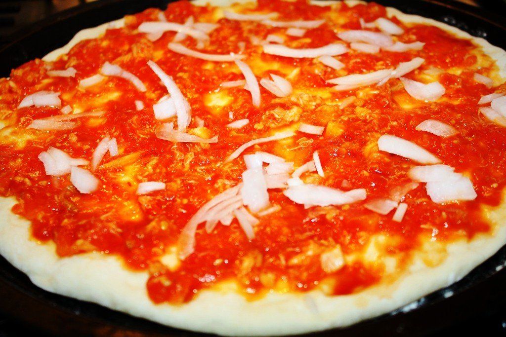 Cubrimos la masa con el tomate que hemos preparado con sabor a langosta y cebolla picada por encima.