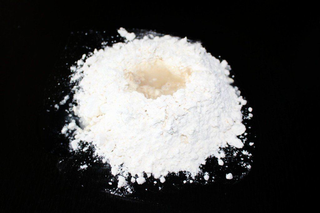 Mezclamos la sal con la harina y diluímos la levadura en un vaso de agua. Hacemos un volcán con la harina y ponemos el agua con la levadura en el interior. Vamos mezclando y añadiendo más agua hasta que deje de pegarse a los dedos la masa.