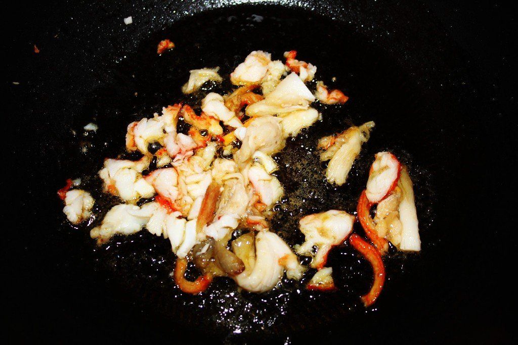 En una sartén ponemos dos cucharadas de aciete de oliva e incorporamos toda la carne de la langosta de cabeza y patas. Sofreímos 2 minutos...