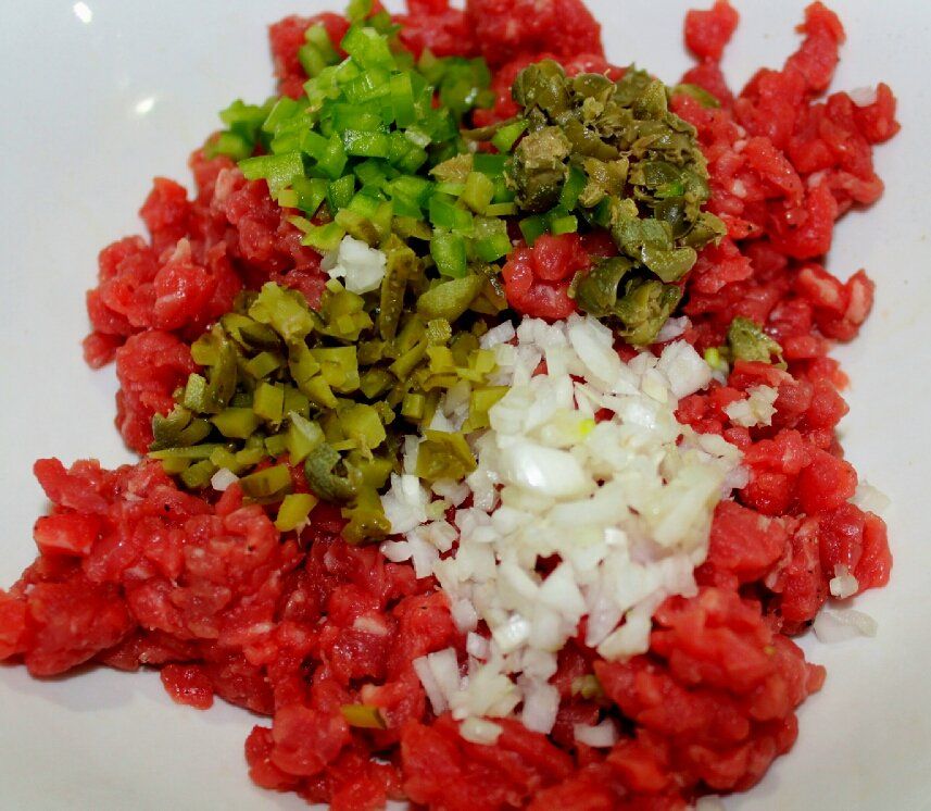 Solomillo de ternera, cebolleta, alcaparras, pimiento verde, pepinillos, huevo duro, mostaza de grano, salsa perrins, tabasco, mahonesa, sal y pimienta.