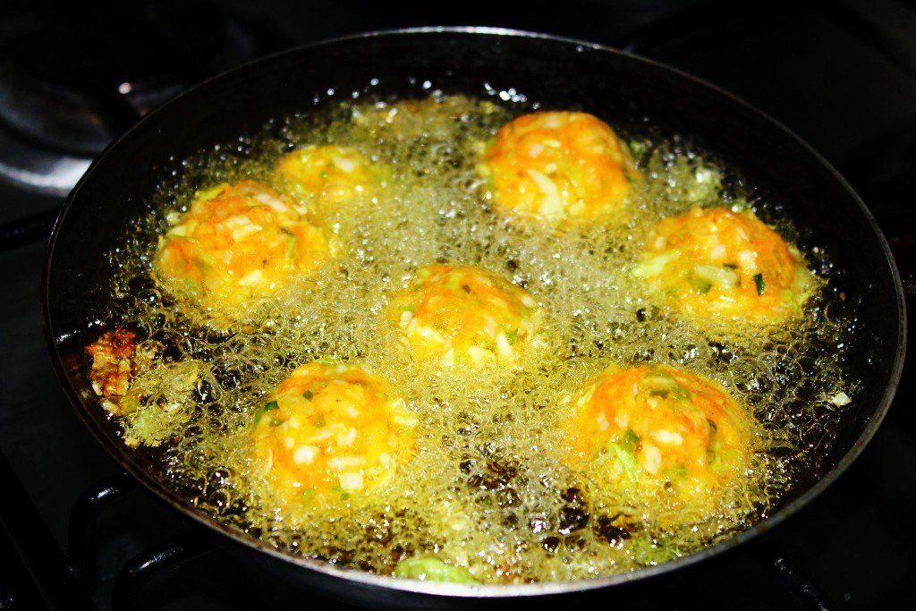 Ponemos sartén al fuego con aceite de girasol para que cubra por encima de la mitad de las bolas. Cuando esté bien caliente el aceite, vamos incorporando las bolitas, dándoles vuelta.