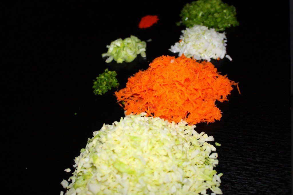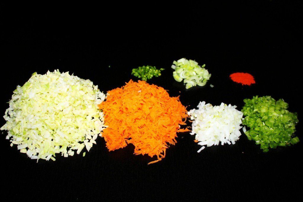 Las cantidades, pues según comensales, pero triple cantidad de col china que de zanahoria, algo menos de cebolla y pimiento verde, y poca cantidad de cebollino y cebolleta fresca. Añadimos también chile muy picado o polvo de chile rojo al gusto. Sal y pimienta.