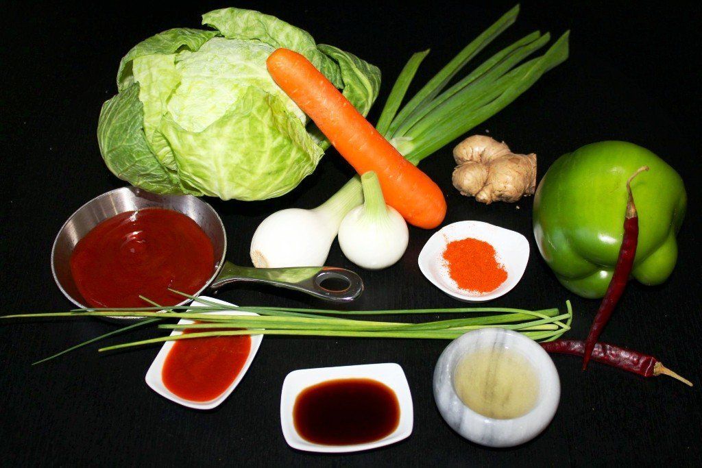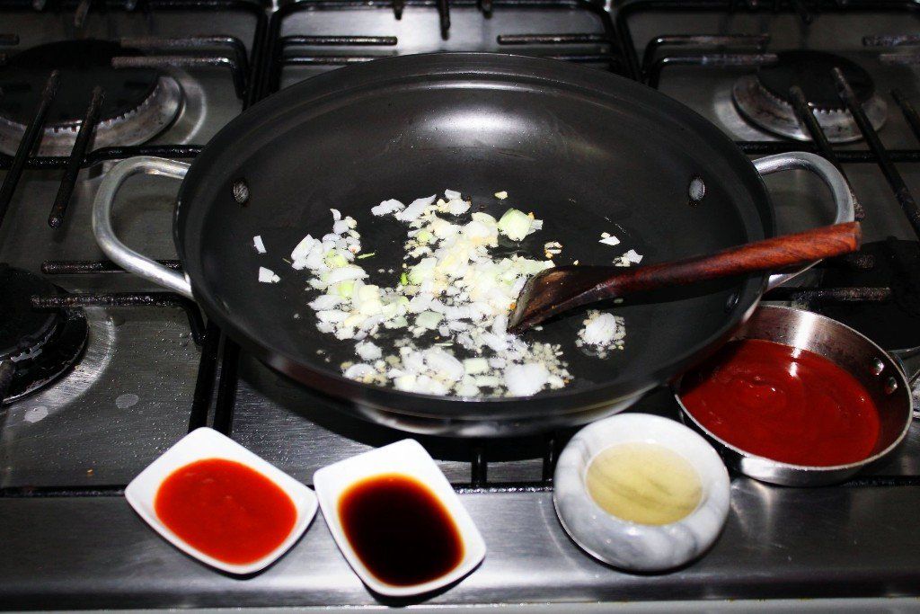 Para la salsa: ajo, jengibre, cebolleta, pasta de chile, vinagre, tomate-ketchup, salsa de soja.