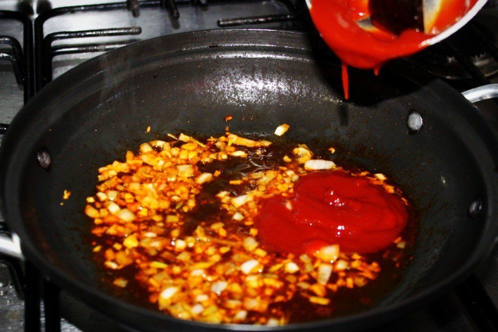 Con la cebolla ya rehogada, incorporamos los líquidos en orden: vinagre (3 cucharadas), salsa de soja (3 cucharadas) pasta de chile rojo (al gusto) y tomate-ketchup (5 cucharadas)
